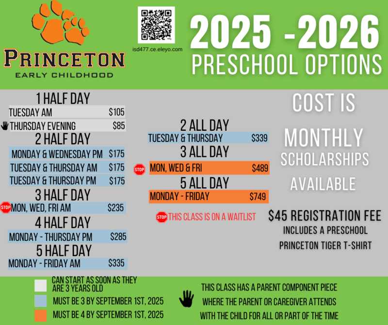 The 2025-2026 Princeton Public Schools Early Childhood Guide is your go-to resource for all things early learning! This guide provides families with essential information about our Hand in Hand Preschool, ECFE (Early Childhood Family Education) programs, Tiger Club wraparound childcare, and more. Inside, you'll find class offerings, schedules, registration details, and helpful resources to support your child’s growth and development. Whether you're exploring preschool options or looking for family education opportunities, this guide is designed to help you navigate the early years with confidence.